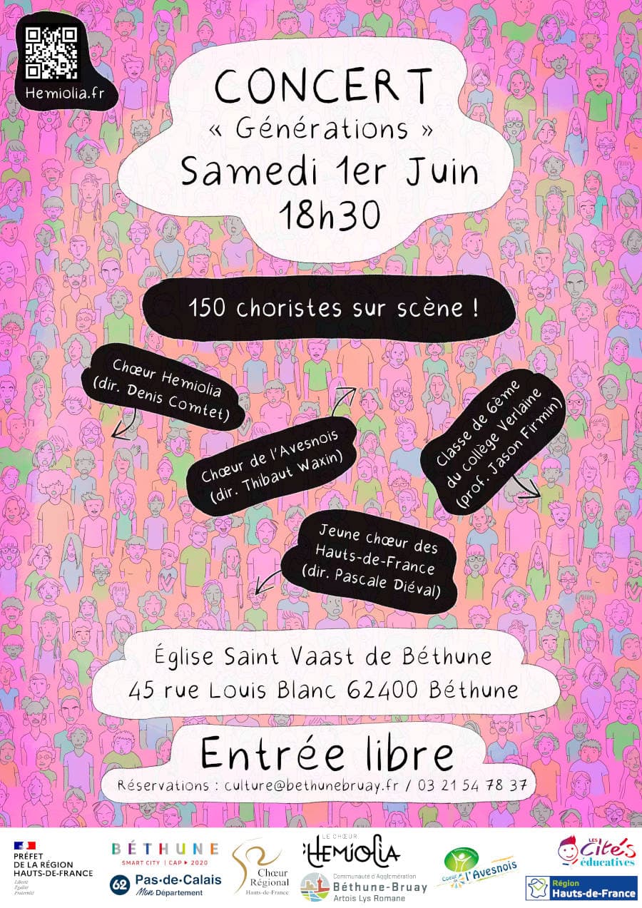 Hemiolia propose un programme intitulé « Générations », associant plusieurs structures culturelles de la région : le Jeune Chœur des Hauts-de-France, le Chœur de l’Avesnois, le collège Verlaine de Béthune, ainsi que le chœur Hemiolia, phalange professionnelle créée en juin 2023 par Denis Comtet.
