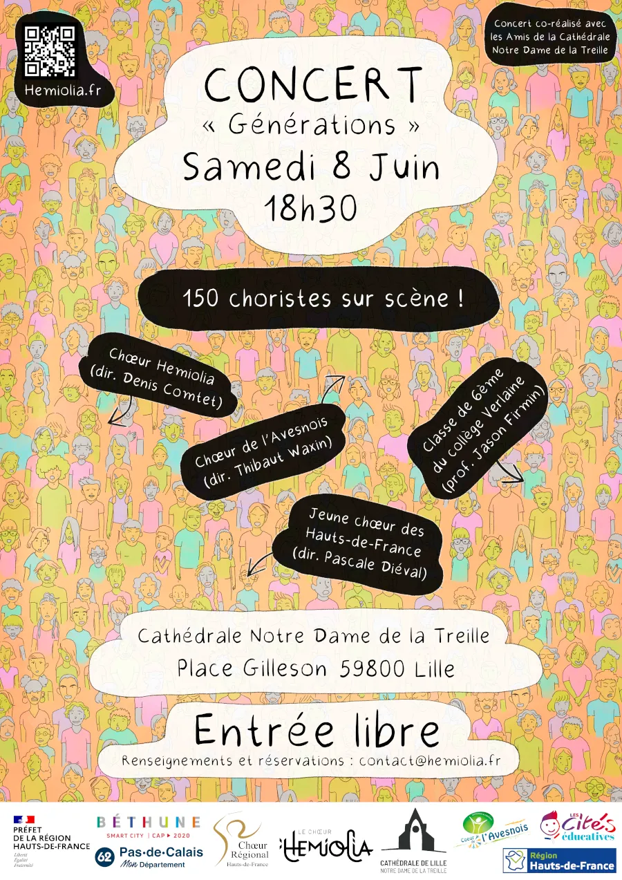 Hemiolia propose un programme intitulé « Générations », associant plusieurs structures culturelles de la région : le Jeune Chœur des Hauts-de-France, le Chœur de l’Avesnois, le collège Verlaine de Béthune, ainsi que le chœur Hemiolia, phalange professionnelle créée en juin 2023 par Denis Comtet.